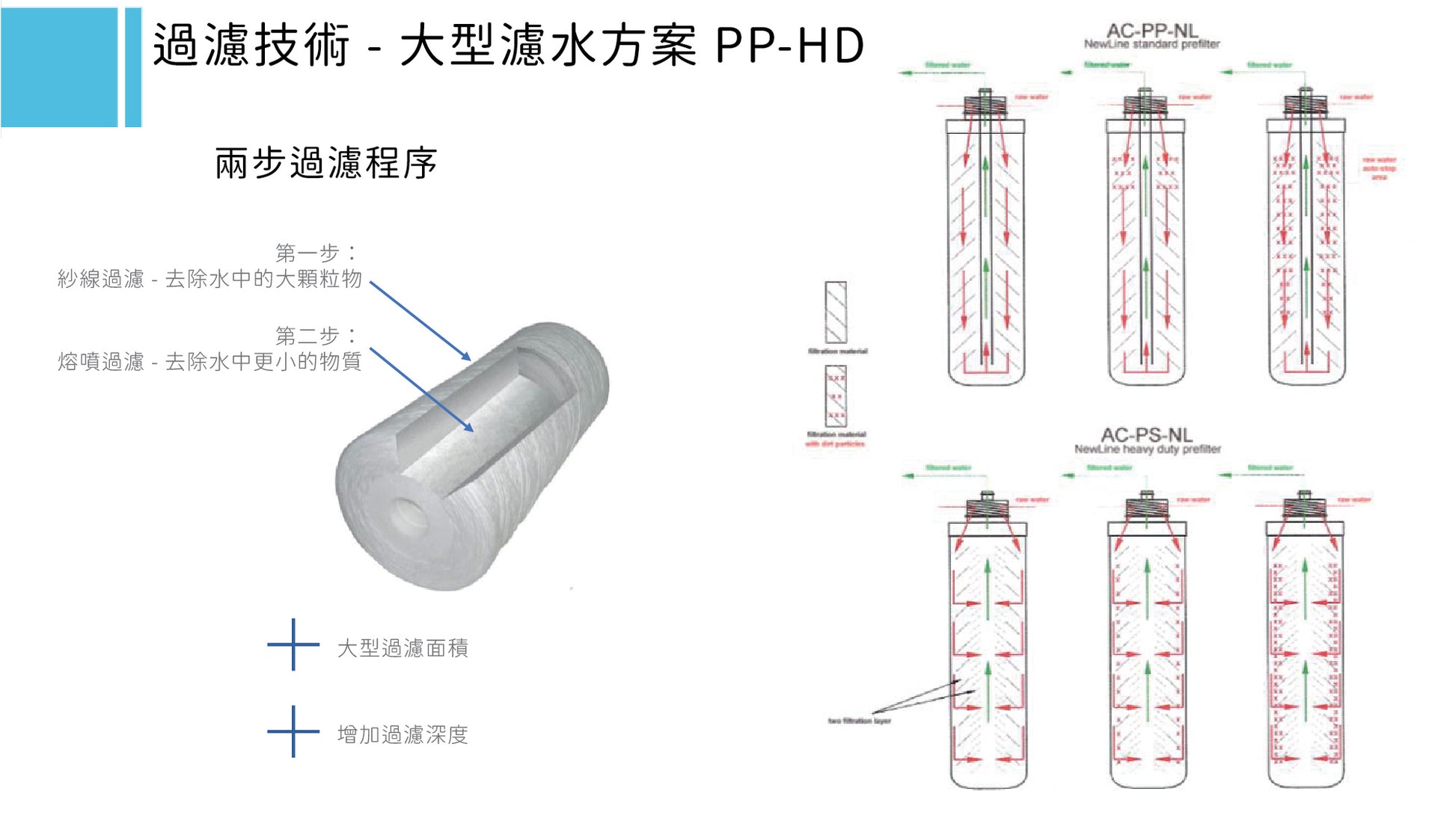PP (Polypropylene 聚丙烯)是一種非常穩定的塑膠材料浸泡在水中不會釋放有 害物質,用 PP 拉成絲線編織後可以成為一種非常有效的過濾棉。按照不同編織 方法,可過濾粒度 20,10,5 微米等粒狀物如鐵鏽,沙泥等,以及菌絲類的粘 稠物等。